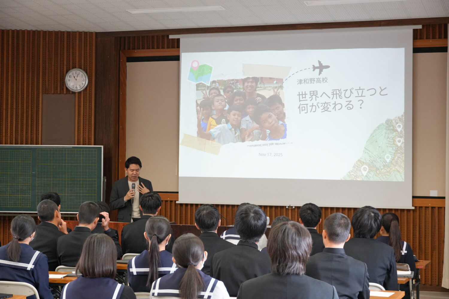 11月18日(火)に1,2年生を対象とした講演会を行いました。「世界に目を向けてみること」や、「外国語などの学習の大切さ」について、株式会社Stapia代表取締役の平岡慎也さんを講師として、講演会を行いました。世界53カ国を旅したことのある平岡さんの豊富な経験について語っていただいた後、「自分が旅をするならどうするか」についてワークシートを記入しながら考えました。講演会を通して、「一歩踏み出てみる」ことや、「やってみたいをやってみる」ことについて意欲を高めることができました。
